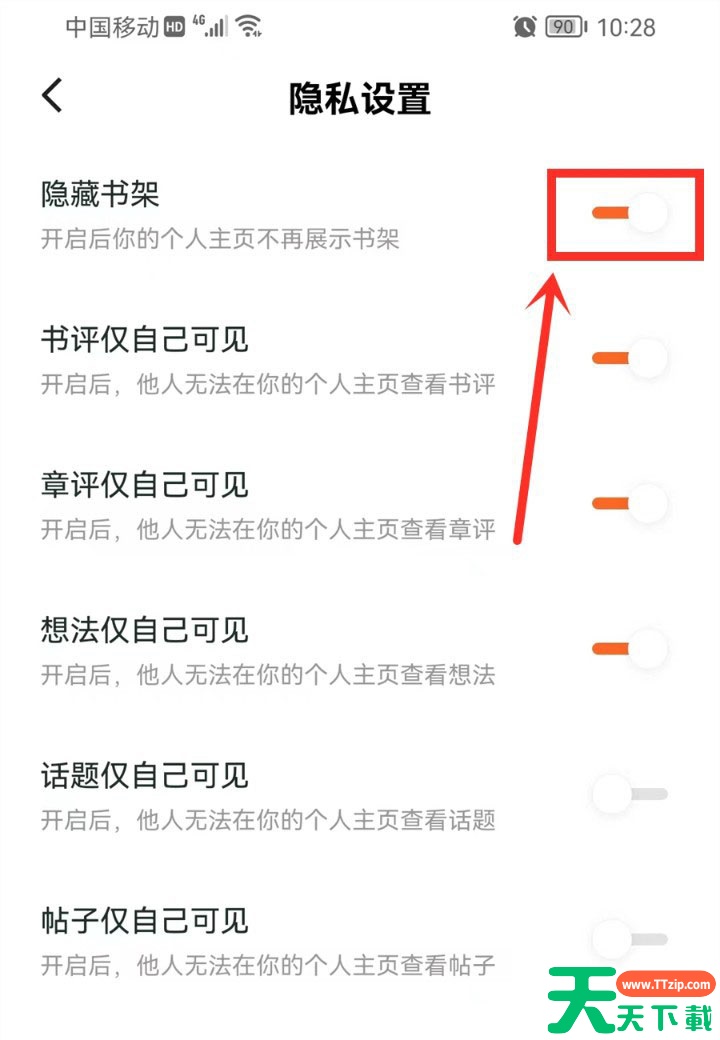 很多小伙伴不知道番茄小说怎么隐藏书架,所以下面天天下载软件站就分享了番茄小说隐藏书架的方法,一起跟着天天下载软件站来看看吧,相信对大家会有帮助。番茄小说怎么隐藏书架?番茄小说隐藏书架的方法1、首先打开番茄小说App,进入我的界面,点击左上角“头像”,如下图所示。2、然后点击页面右上角“三个点”,如下图所示。3、接着在弹出的菜单中选择“隐私设置”,如下图所示。4、最后打开“隐藏书架”开关,即可隐藏小说书架,如下图所示。上面就是天天下载软件站为大家带来的番茄小说怎么隐藏书架的全部内容,更多手机教程尽在天天下载。@天天下载TTzip 除特别注明外,本站所有文章均为 天天下载 原创,转载请注明出处来自 https://www.ttzip.com/203354.html