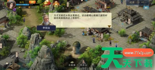 触发招募文韬任务后前往成都场景的28.43坐标点位置跟李现治进行对话,选择【文鸯后人】选项,这时李现治会讲述文韬去峨眉山采集药材的信息。