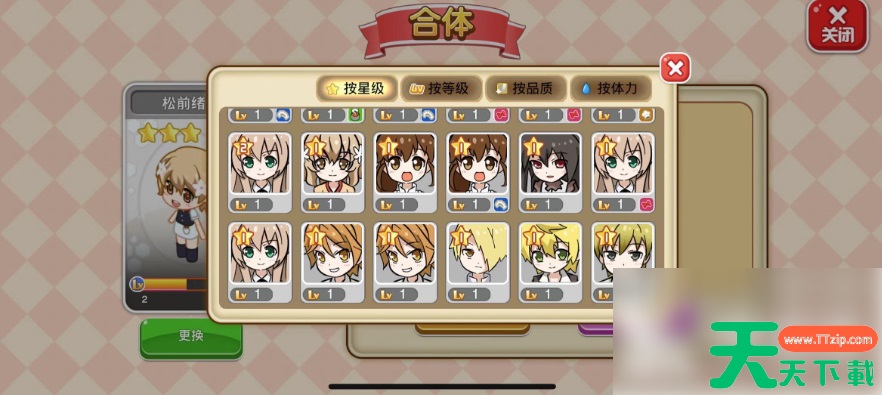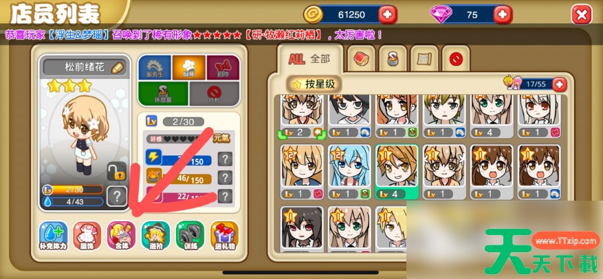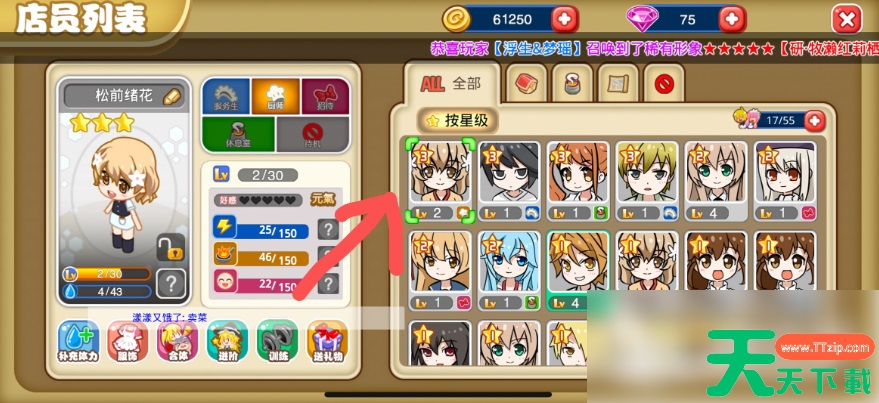 第二步:在店员的详情界面,可以看到我们所拥有的所有店员的列表,店员头像的左上方显示他们的星级,正下方显示他们的等级,有的店员还会出现重复(因为召唤店员的时候是随机的)。点击一个我们想要合并的店员头像,进入这个店员的操作界面。