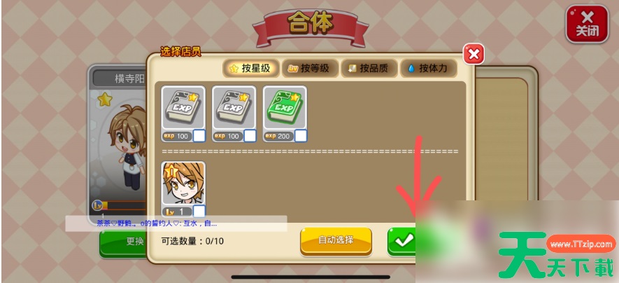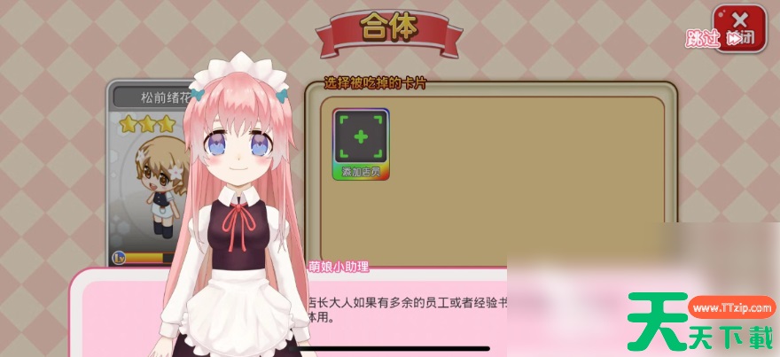 第四步:一般来说,选择合并的卡片最好是相同的,这样提升的星级的可能性更高,如果稀有和稀有的合并,店员的能力会得到十分大的提升。点击合体界面的+号,然后就会弹出一个可以用于合并的所有卡片。点击选择要用于合并的卡片。