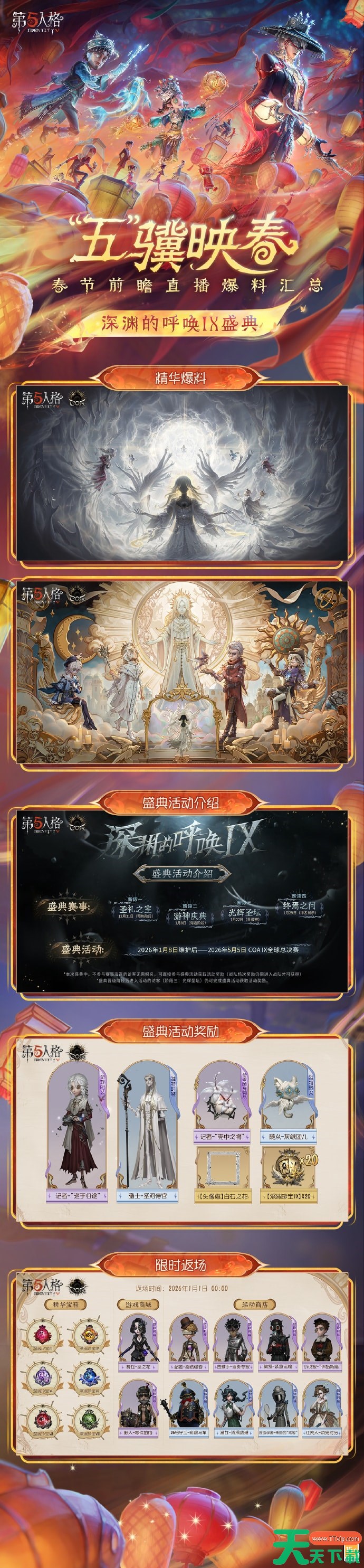 第五人格即将迎来春节,这次的春节前瞻直播有不少的活动内容,那么这次春节前瞻直播究竟有哪些活动呢?下面就让我们来看看第五人格春节前瞻直播直播前瞻总结。