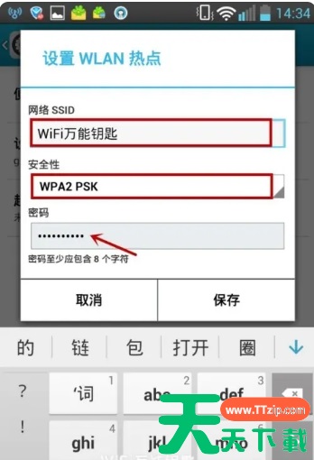 2、点击“设置WLAN热点”,自定义热点名称和密码,安全性选择“WPA2 PSK”(确保加密安全)。