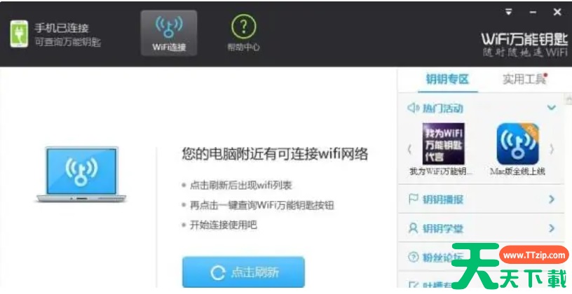 4、打开电脑端的WiFi万能钥匙界面,点击“刷新”会显示周围可用WiFi,连接目标WiFi。