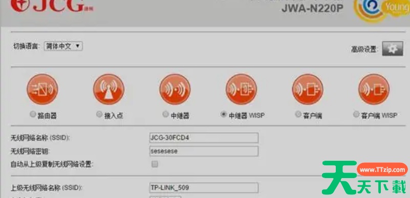 7、接着断开电脑与手机热点的连接,将中继器通电并连接至电脑。在浏览器地址栏输入中继器默认IP地址(如192.168.10.1),进入设置界面,选择“WISP模式”(无线中继模式)。