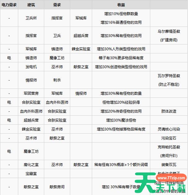 但利用电力的房间,包括合膚實驗室(怪物增加 20% 經驗獲得)、鑄造師(箱子有30%更多物品稀有度)、超越兵營(增加 30%魔法怪物)、魔像工坊