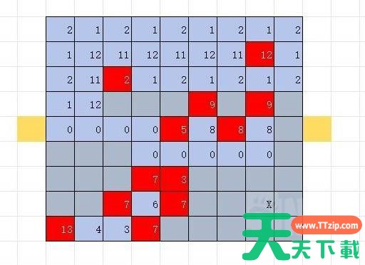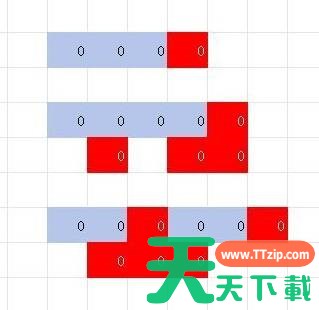 如图所示,0表示通路,红色区域为可能坍塌的区域,蓝色为稳定区域。