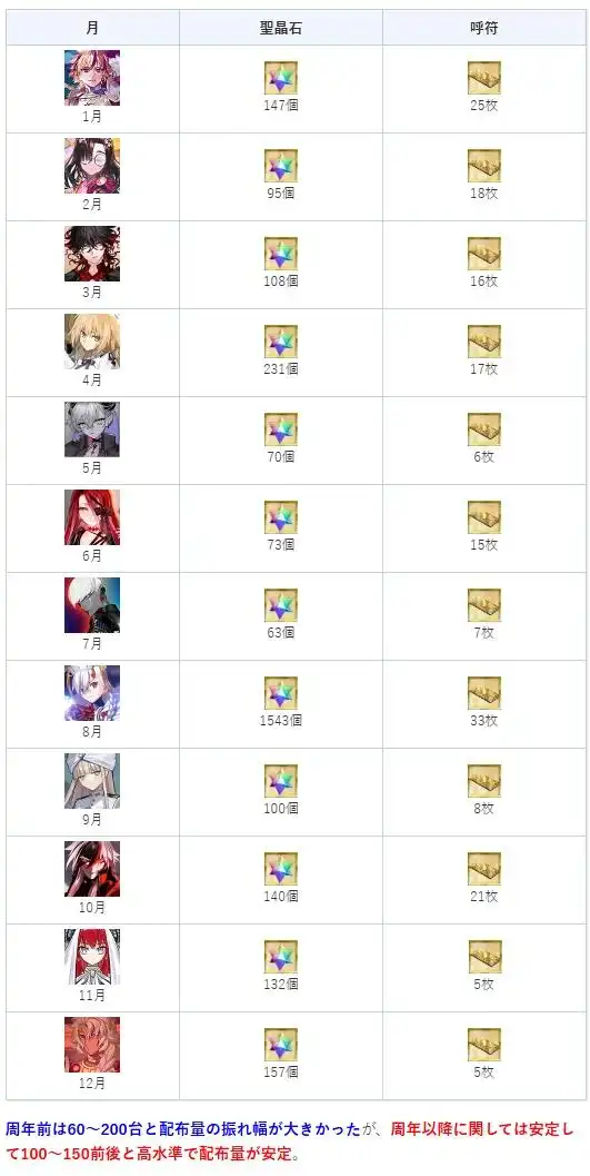 可以看到,大部分月份每月的圣晶石都达到100个以上。其中让人印象最深刻的就是周年发放了1000个圣晶石,算上整个周年的奖励,一共是1395个圣晶石,如果是幕间和强化本追加的任务算上,还会增加120个。
