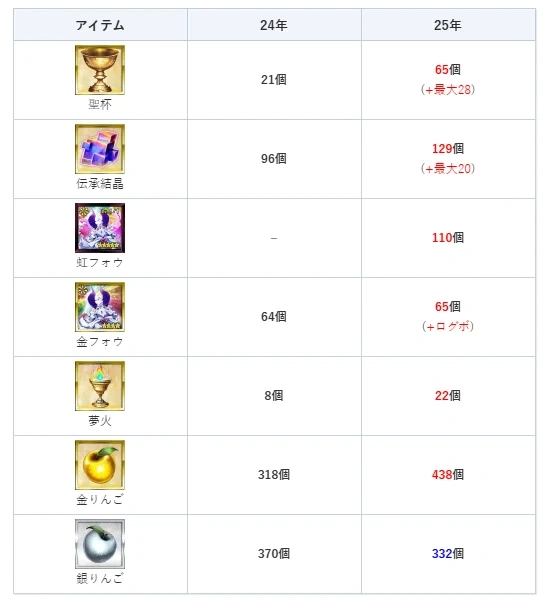 最后就是其他稀有材料跟去年的比较,除了四星芙芙的获取固定之外,其他奖励都是大幅度提升,不过四星芙芙数量虽然一样,但是多了五星芙芙。