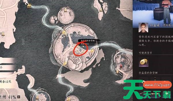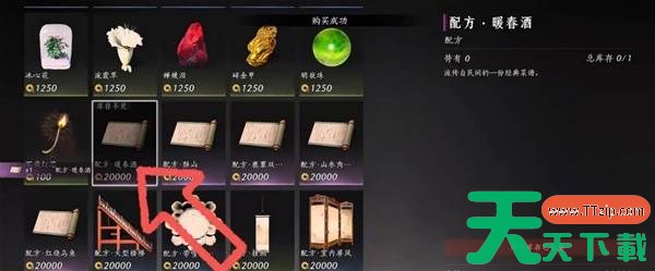 传送到凉州的【天水集市】,找到NPC孙孟梁(下图红圈位置),购买【暖春酒】配方,然后在包裹-制造-烹饪里制作即可。