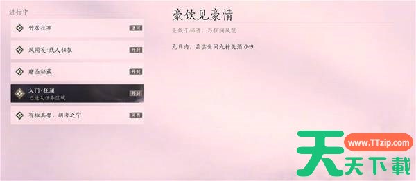首先传送到清河的【七伐坡】,在【北盟遗址】这里完成祭莫先贤的仪式,完成仪式后,看过入门信,就会接到【豪饮见豪情】任务,任务要求是在九日内,品尝世间九种美酒。