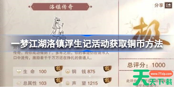 以上就是一梦江湖洛镇浮生记活动获取铜币方法的全部内容了,希望玩家可以顺利的知道怎么获取铜币,更多精彩内容请关注天天下载(ttzip.com)。