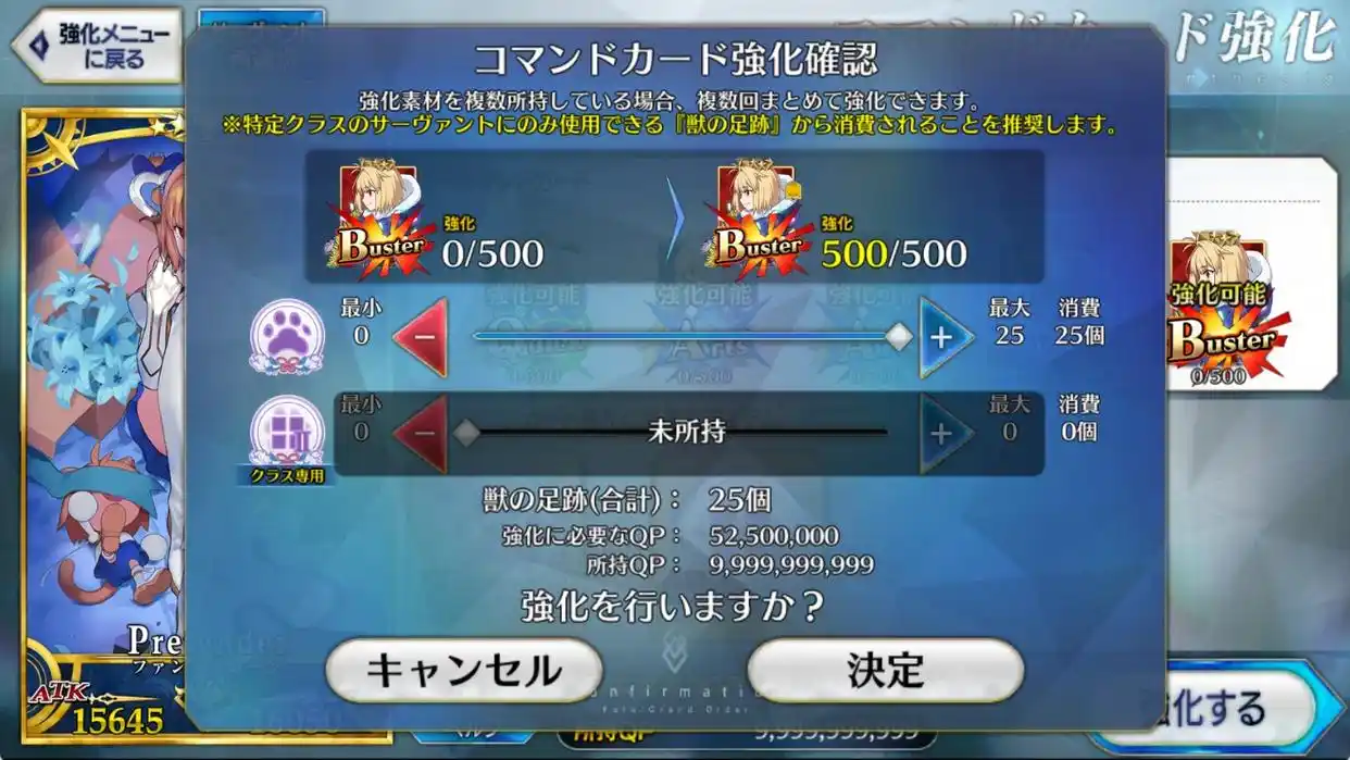 然后就是指令卡强化,每次强满一张指令卡都需要消耗5250QP,大家可以把类似学姐、所长、弓凛、月批、藤蔓之类优质暴击输出,以及类似狂娜、库库尔坎等三红狂阶的指令卡都强化一下。