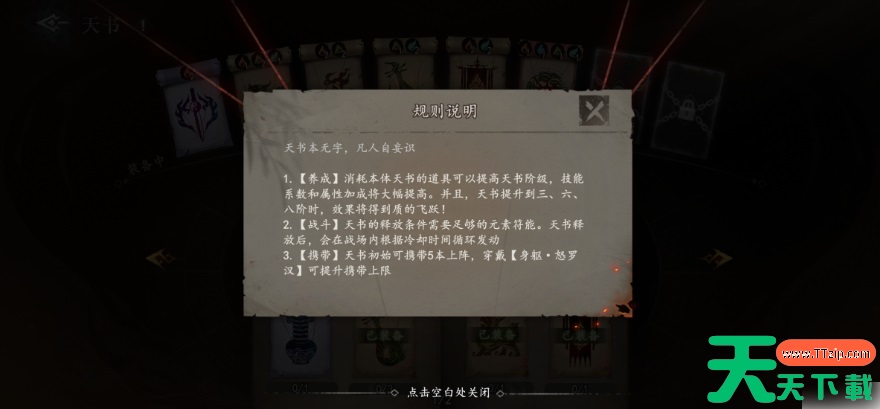 天书的释放条件需要满足足够的元素符文,对应元素符文的个数在天书图标上方有显示,元素符文分为火、水、土、风四种。