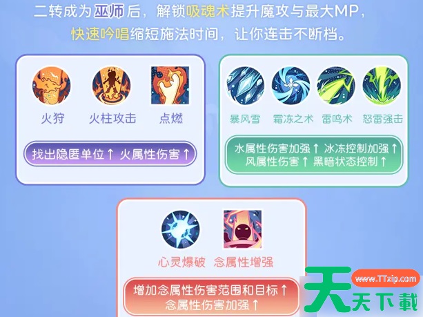 2、二转成为巫师后,解锁吸魂术提升魔攻与最大MP,快速吟唱缩短施法时间,让你连击不断档。