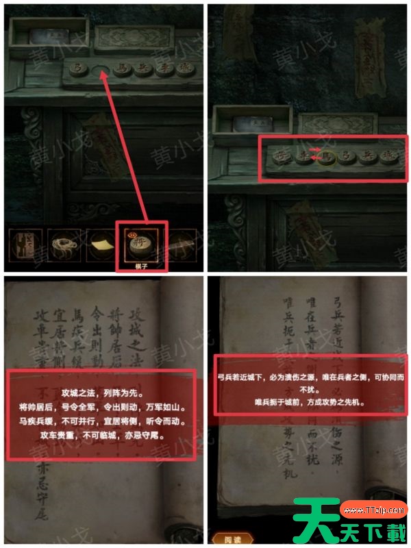 9、把【棋子】放到木盘上,根据《攻城》上的线索,正确摆放棋子的位置,旁边的画布掉落