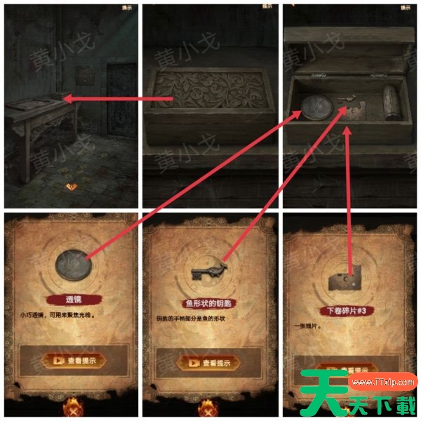 12、点击打开桌子上的盒子,触发剧情,获得【透镜】、【鱼形状的钥匙】和【下卷碎片3】