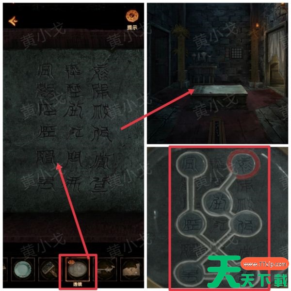 13、点击石床上的字,使用【透镜】,获得线索
