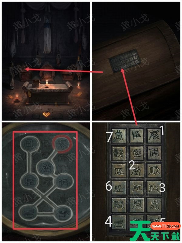 14、点击左侧棺材上的机关,根据[主殿]石床上的线索,按顺序按下字按钮,打开棺材