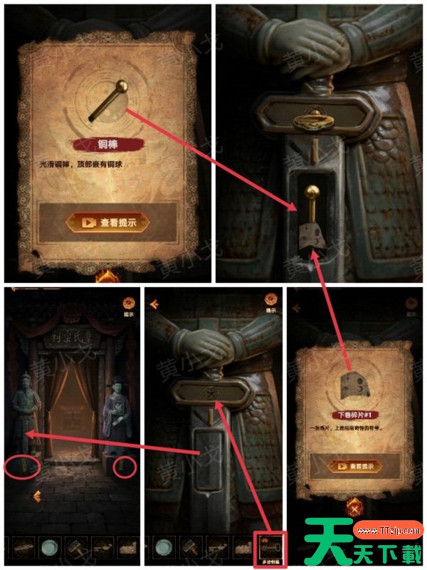 16、点击武将瓷偶的剑,用【多齿钥匙】打开暗格,获得【下卷碎片1】和【铜棒】