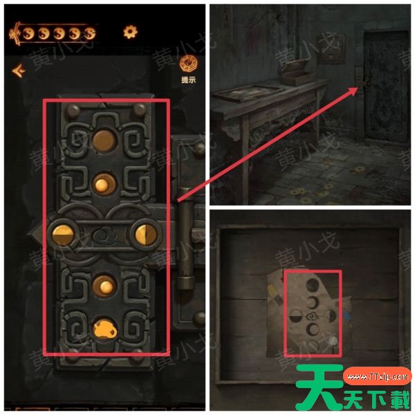 18、点击门旁边的密码锁,根据拼合起来的两张碎片上的线索,调整密码锁,打开门