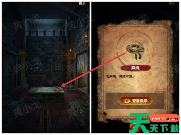 1、拾取石床上的【麻绳】