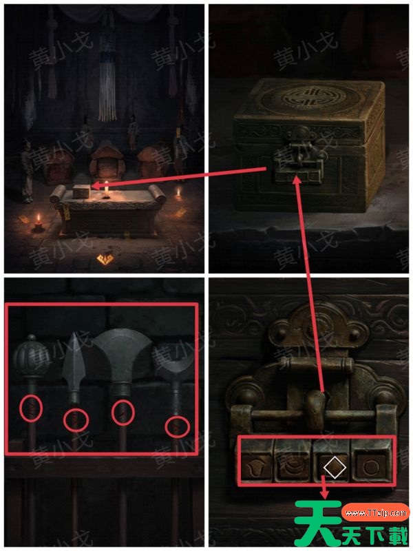 4、点击石桌上的盒子,根据[主殿]武器架上武器的形状和红线数量,调整密码锁