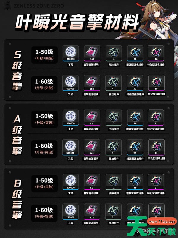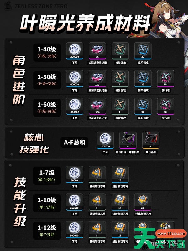 绝区零上线了2.5版本,在新版本将会上线新角色叶瞬光,很多玩家都想知道叶瞬光的升级突破材料,下面就让我们来看看绝区零叶瞬光升级突破材料吧。 绝区零叶瞬光升级突破材料 以上就是绝区零叶瞬光升级突破材料的全部内容了,希望玩家可以顺利的知道需要哪些材料,更多精彩内容请关注天天下载(ttzip.com)。 @天天软件站Ttzip 除特别注明外,本站所有文章均为 天天下载 原创,转载请注明出处来自 https://www.ttzip.com/204117.html
