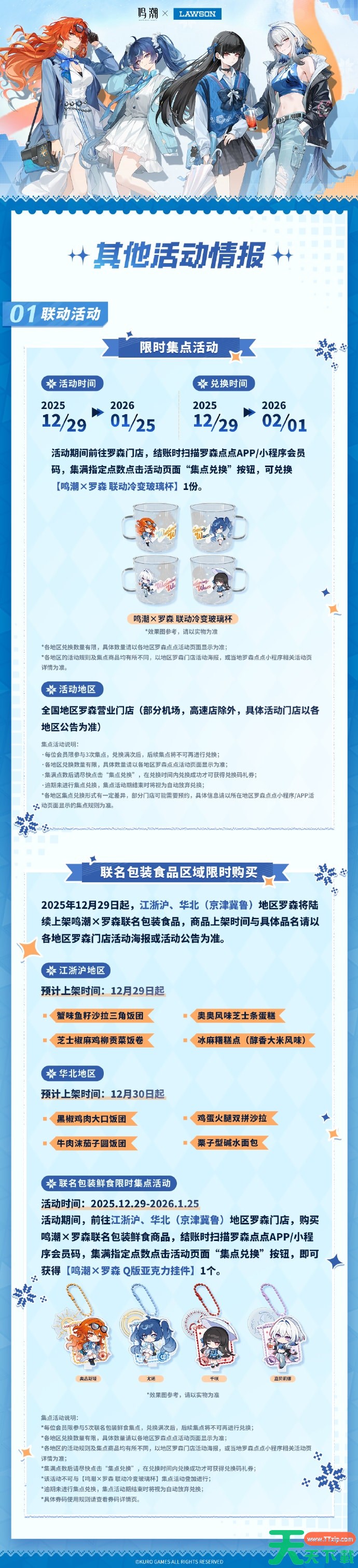2025年12月29日起各地区主题店将陆续开启,全国27家鸣潮×罗森主题门店将正式上线,欢迎各位漂泊者到店打卡!