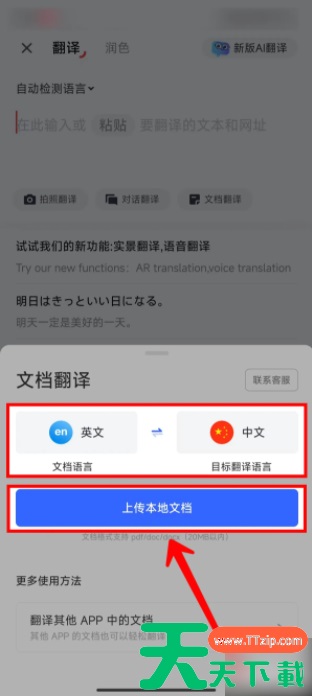 在文档翻译页面设置要翻译的语言后,点击【上传本地文档】。