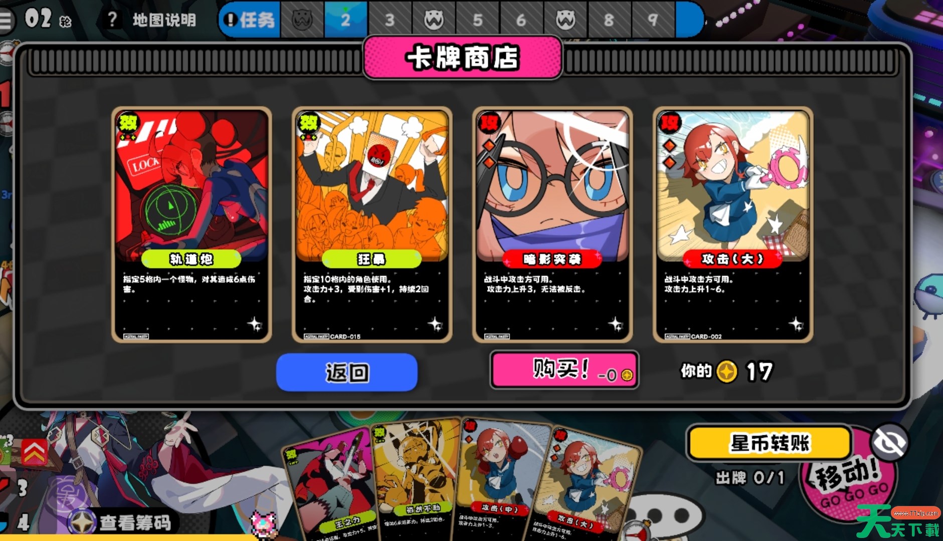 PVE下的战斗模式与PVP里的区别不大,都有主动攻击和被动接战的设定,人们可在路过怪物身边时主动向怪物进攻,利用技能的加成或手牌来叠加攻击力,并通过投掷骰子的方式来决定本次战斗自己所能打出的伤害,而被动接战则需要投掷骰子来判定防守力度和是否闪避成功。此外,PVP中的星币除了拿来升星外就只有买牌这一用处,所以各位不用像PVP那样存着等判定,当商店里刷出想要买的牌后可立刻买下,且多买些能造成真伤的手牌用来攻击怪物。