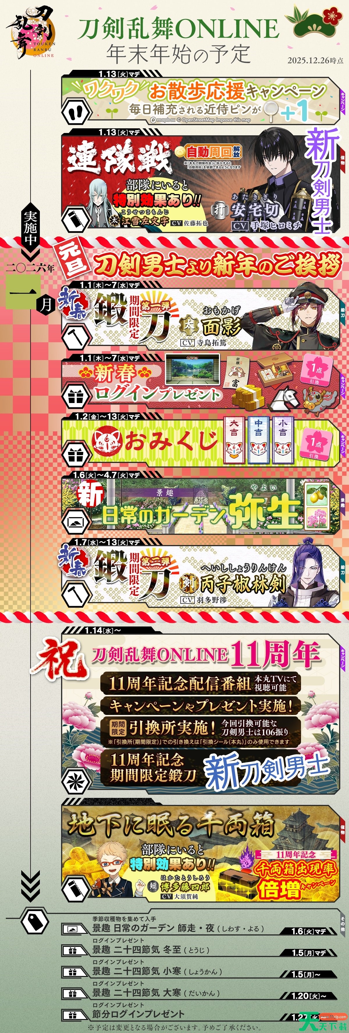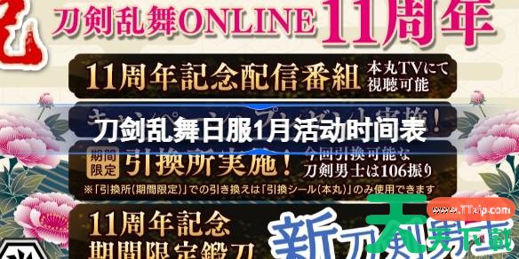 1月就要来了,相信有不少的刀剑乱舞日服玩家想知道2026年1月都有哪些活动吧,这里天天下载TTzip将为大家带来刀剑乱舞日服1月活动时间表,让我们一起来看看刀剑乱舞日服1月有哪些活动2026吧。 刀剑乱舞日服1月活动时间表 以上就是天天下载(ttzip.com)为大家带来的刀剑乱舞日服1月活动时间表解答,大家都了解了吗?还想要了解更多的内容那就请继续关注天天下载(ttzip.com)吧。 @天天软件站Ttzip 除特别注明外,本站所有文章均为 天天下载 原创,转载请注明出处来自 https://www.ttzip.com/204185.html
