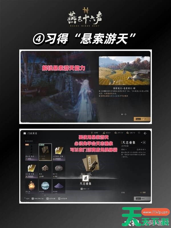 以上就是天天下载(ttzip.com)为大家带来的燕云十六声悬索游天获取方法,大家都了解了吗?还想要了解更多的内容那就请继续关注天天下载(ttzip.com)吧。