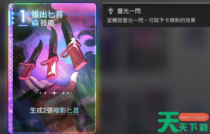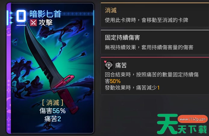 那这里进行生成的时候就是零费的普通匕首了,所以如果要玩奶刀的话,基本上每一把都是去赌能不能拿到暗影上膛的强化版本,拿到之后还不行,至少给他复制一张或者2张,否则匕首数量是不够用的,那么除了变体4以外,天天下载Ttzip最推荐的可能就是变体3,这里可以让卡牌治愈108×X,然后生成X张的暗影匕首,也就是说大家每用掉一点的能量,就能拿一张暗影匕首,另外一个值得推荐的是这个二费的群体效果卡,如果选择了这个变体,那大家就需要想办法多弄几张暗影匕首在自己的手里,因为她的基础效能实际上已经比匕首要强了,因为匕首是达到50%数值之后上痛苦,而这个群体的暗影上膛首先基础伤害就多了30%,并且依旧上痛苦,还能解决德蕾莎的缺点,就是她没有办法对群。
