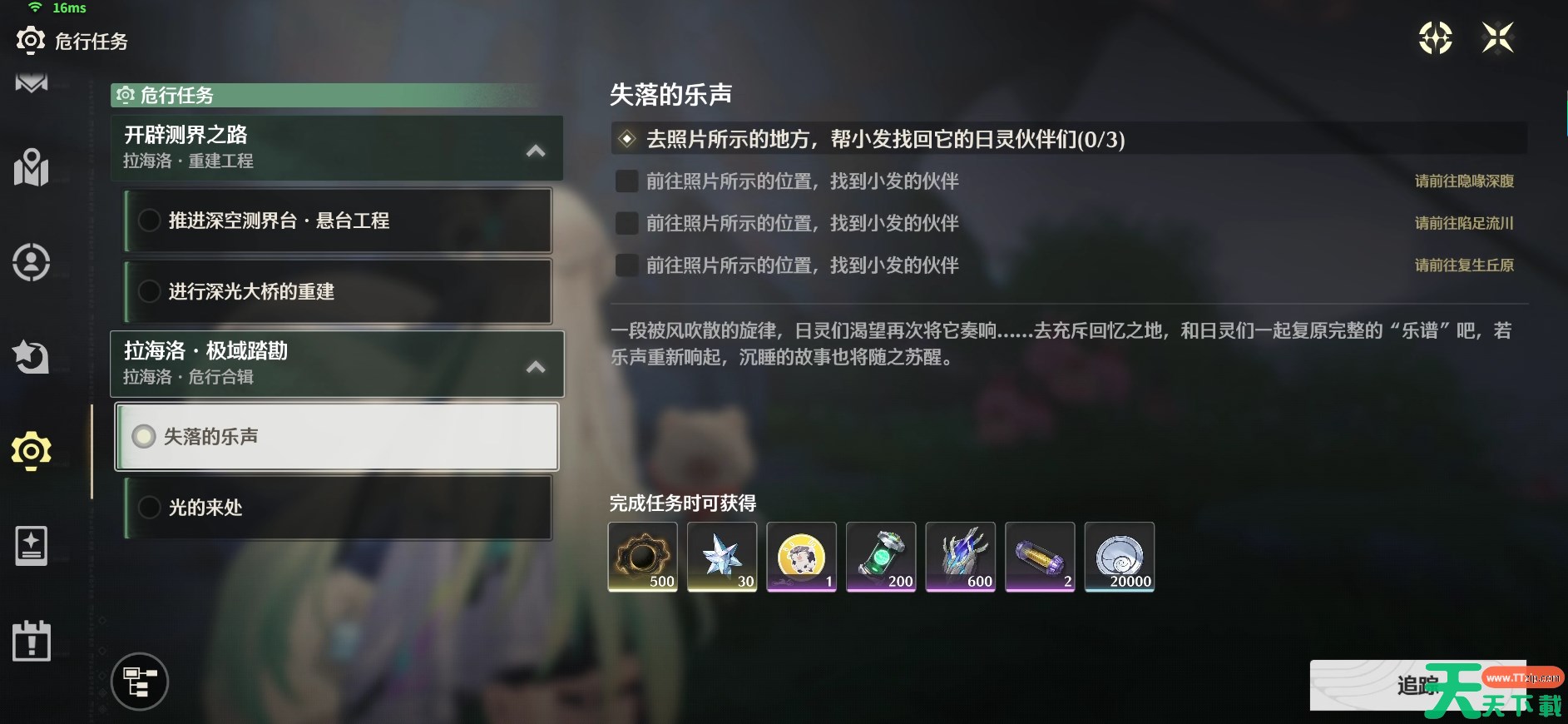 鸣潮3.0版本已经上线,在游戏中有一个危行任务——失落的乐声,这个任务需要玩家找到三个日灵,那么这个任务究竟怎么完成呢?下面就让我们来看看鸣潮失落的乐声任务攻略吧。
