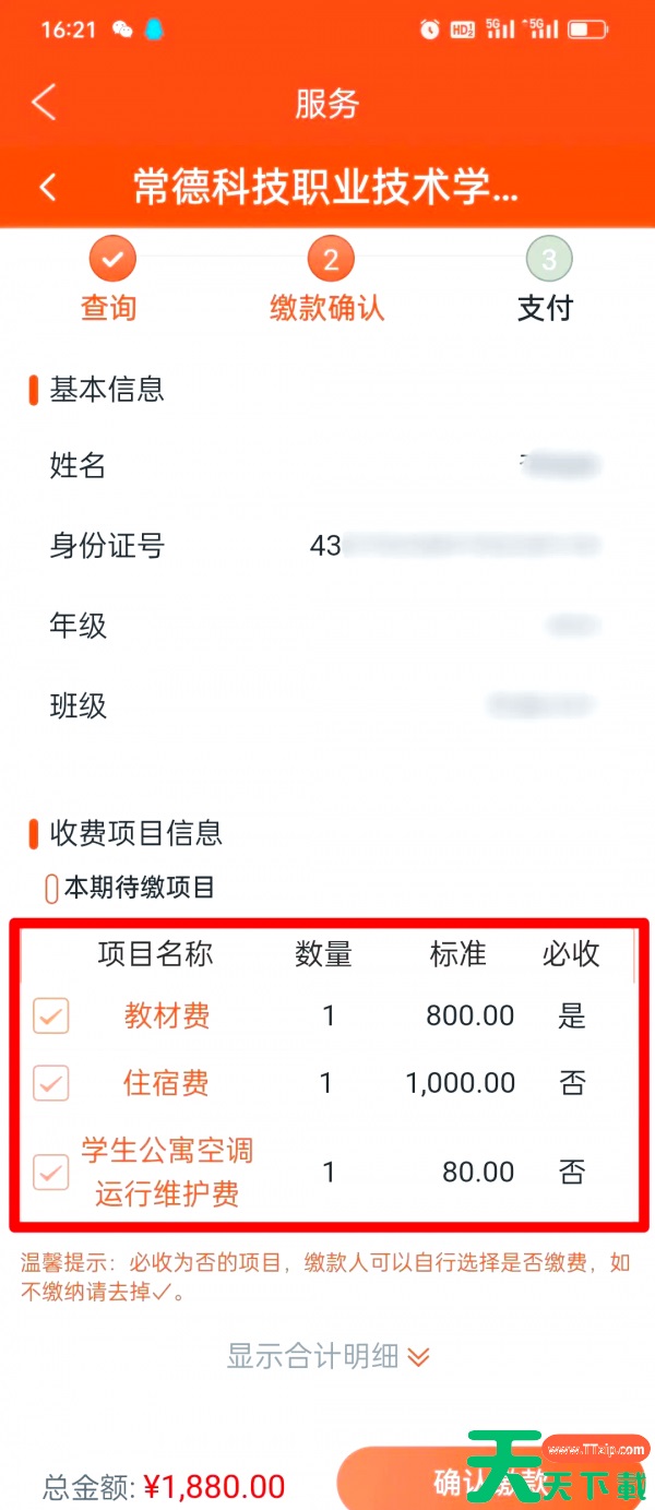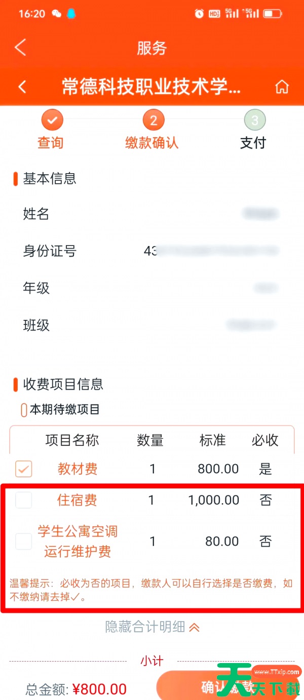 在确认学生信息无误后,您可以进一步仔细检查并详细核对缴费明细。一旦确认无误,便可选择适合您的支付方式来完成支付过程。