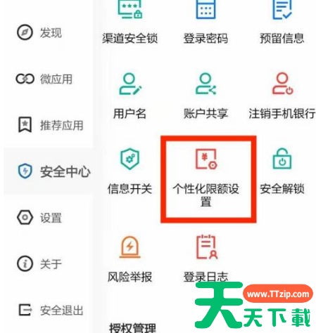 在打开的菜单列表中,依次打开【安全中心】-》【个性化限额设置】选项,如下图所示。