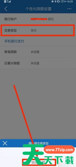 在打开的个性化限额设置页面,打开【交易类别】选择窗并选择【转账汇款】选项,如下图所示。