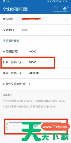 在选择转账的交易类别之后,设置手机银行转账【日累计限额】后,点击【修改】,完成账号身份验证通过后,即可设置成功。如下图所示。