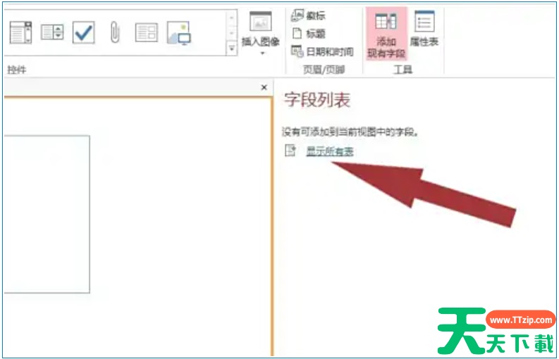 5、然后在当前窗口中,给标签页控件“添加现有字段”,鼠标左键单击“显示所有表”。