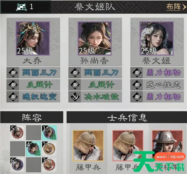 2、因为大乔自身带有一定坦度,且需要与孙尚香互踩追击格,兵种选择上,推荐藤甲兵或陷阵营在前排抗伤,后排补充一个穿杨军或连弩军补伤害。