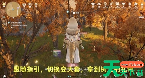 4、根据指引寻找遗落在树上的礼物,切换变大套装,从树上取得礼物