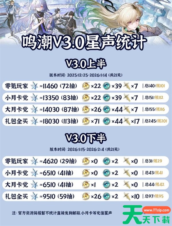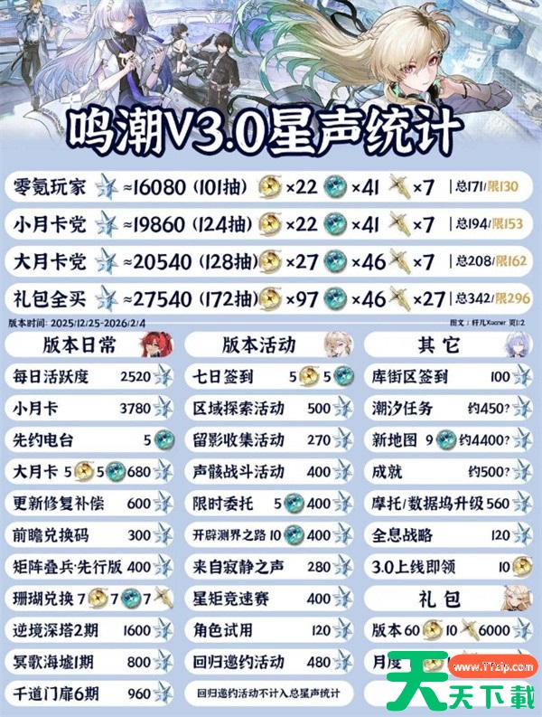 实际可获取星声数量,仍需以版本正式上线后的活动、任务与补偿为准,后续若追加活动或临时福利,总抽数仍有上浮空间。具体抽数请参考下图,总的来说零氪党在整个大版本中可获得大约171抽,其中131抽为限定抽数。