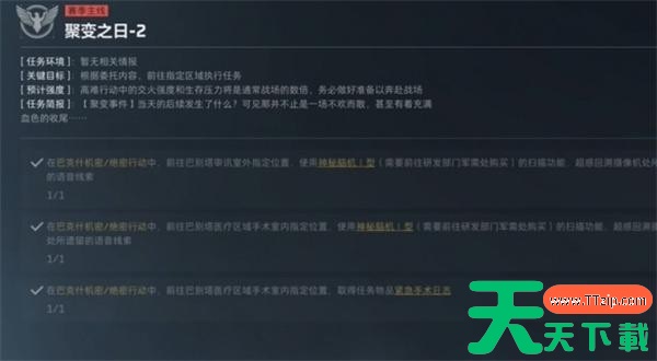 在巴克什机密/绝密行动中,前往巴别塔医疗区域手术室内指定位置,使用【神秘脑机Ⅰ型】(需要前往研发部门军需处购买)的扫描功能,超感回溯摄像机处所遗留的语音线索