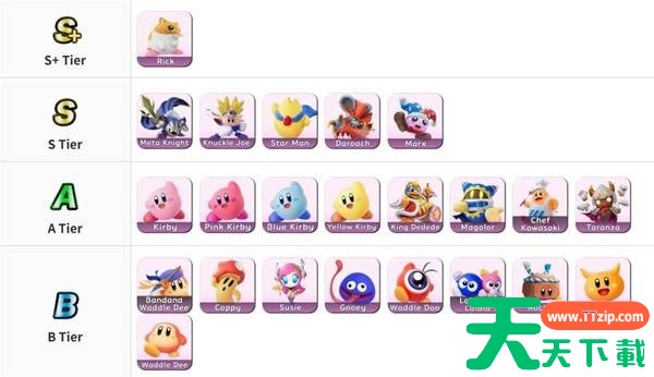 A级:卡比、粉色卡比、蓝色卡比、黄色卡比、帝帝帝大王、魔洛屈、厨师川崎、塔兰扎
