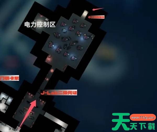 二级凭证也是一次性道具,在二层开门以后可以进电力控制区,拉闸之后才可以打路障boss。另外贴水印的高亮位置,也有概率刷空间防护服,清图之后记得来看看。