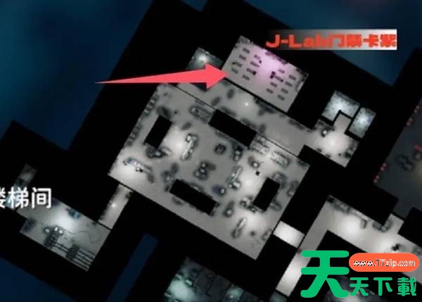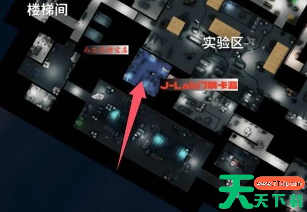 很好找我们进实验室的入口,对直往前走就能找到,因为是放映室用的投影,切大地图看到是黑的。这个地方有游戏卡带,有J-Lab箱是个不错的物资点。