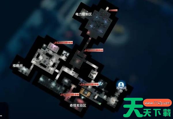 地下一层一共有4把钥匙分别是,J-Lab放映室钥匙、J-Lab门禁卡红、绿、蓝,下面就用颜色简称了。