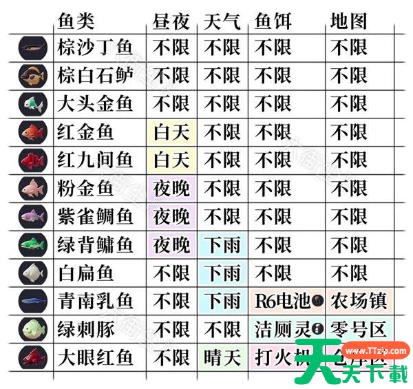 逃离鸭科夫钓鱼点在哪,各类稀有的鱼种怎么获取?接下来天天下载Ttzip将为大家详细的介绍下钓点和鱼获取的方式,让大家能够在不同的钓点之中获取不同类型稀有的鱼。 逃离鸭科夫钓鱼点位置详情 零号区 位置1 - 公路营地(矮鸭营地)左侧湖边 零号区 位置2 - 北山炸墙入口 下方左侧 仓库区 钓鱼点 - 西厂区门外右侧 湖上 农场镇 钓鱼点 - 右下方捕鱼码头 深处大平台@天天下载TTzip 除特别注明外,本站所有文章均为 天天下载 原创,转载请注明出处来自 https://www.ttzip.com/204717.html
