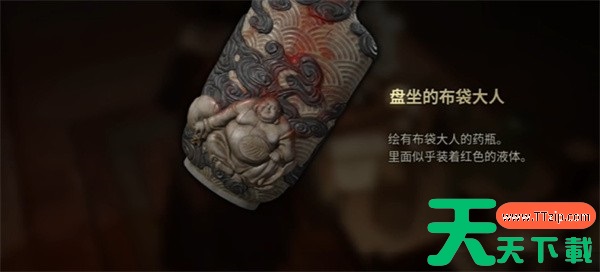 在寺庙桌子上可见一个药瓶,即【盘坐的布袋大人】,绘有布袋大人的药瓶,瓶内盛有红色液体。