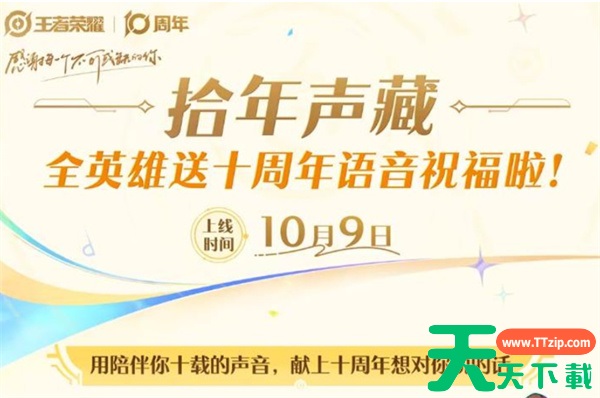 王者荣耀已经十周年了,游戏也是在10月9日上线了全新的游戏活动,有着超多的趣味游戏内容,轻松获得各种的角色语音和奖励,天天下载Ttzip就为大家详细的进行内容介绍,快来一起看看吧!